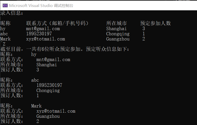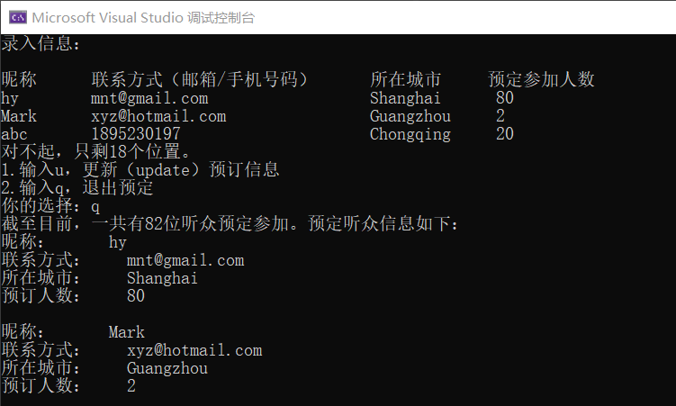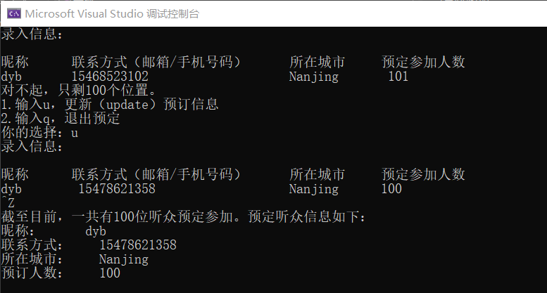 1 #include<iostream> 2 #include<vector> 3 #include<string> 4 #include"info.hpp" 5 int main() 6 { 7 int num, sum = 0; 8 string nam, con, cit; 9 const int capacity = 100; 10 vector<info>audience_info_list; 11 cout << "录入信息:" << endl << endl 12 << "昵称 " << "联系方式(邮箱/手机号码) " << "所在城市 " << "预定参加人数" << endl; 13 while (cin >> nam) { 14 cin >> con >> cit >> num; 15 sum += num; 16 if (capacity - sum >= 0) { 17 info a0 = info(nam, con, cit, num); 18 audience_info_list.push_back(a0); 19 } 20 else { 21 sum -= num; 22 cout << "对不起,只剩" << (capacity - sum) << "个位置。" << endl 23 << "1.输入u,更新(update)预订信息" << endl 24 << "2.输入q,退出预定" << endl 25 << "你的选择:"; 26 string choice; 27 cin >> choice; 28 if (choice == "q") break; 29 if (choice == "u") { 30 cout << "录入信息:" << endl << endl 31 << "昵称 " << "联系方式(邮箱/手机号码) " << "所在城市 " << "预定参加人数" << endl; 32 continue; 33 } 34 } 35 } 36 cout << "截至目前,一共有" << sum << "位听众预定参加。预定听众信息如下:" << endl; 37 for (int i = 0; i < audience_info_list.size(); i++) { 38 audience_info_list[i].print(); 39 cout << endl; 40 } 41 }
