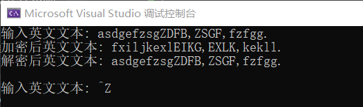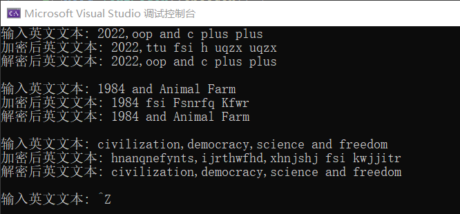 1 #include "textcoder.hpp" 2 #include <iostream> 3 #include <string> 4 void test() { 5 using namespace std; 6 string text, encoded_text, decoded_text; 7 cout << "输入英文文本: "; 8 while (getline(cin, text)) { 9 encoded_text = TextCoder(text).get_ciphertext(); // 这里使用的是临时无名对象 10 cout << "加密后英文文本:\t" << encoded_text << endl; 11 decoded_text = TextCoder(encoded_text).get_deciphertext(); // 这里使用的是临时无名对象 12 cout << "解密后英文文本:\t" << decoded_text << endl; 13 cout << "\n输入英文文本: "; 14 } 15 } 16 int main() { 17 test(); 18 }