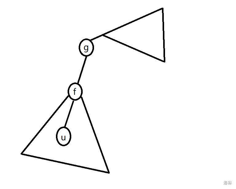 考虑图示情况,我们希望分辨结点 \(u\) 的父亲 \(f\) 和爷爷 \(g\)。我们需要找到一个根开始 dfs。