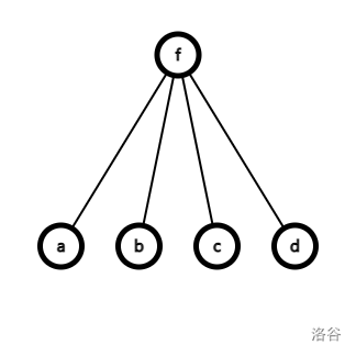 发现这个局部长得很像一个菊花。所以我们可以在这里沿用菊花的做法,就是我们不分别从 \(a, b, c, d\) 开始 dfs,而是只从 \(f\) 开始 dfs 一遍。但是这样就无法分辨 \(a, b, c, d\) 和 \(f\) 的父亲。根据菊花的做法,我们可以在第一次遍历到 \(f\) 的时候以 \(a, b, c, d\) 的顺序遍历其儿子,第二次遍历的时候就以 \(d, c, b, a\) 的顺序遍历其儿子。这样 \(a, b, c, d\) 必没有父子关系,都是 \(f\) 的儿子。如此就可以分辨了。