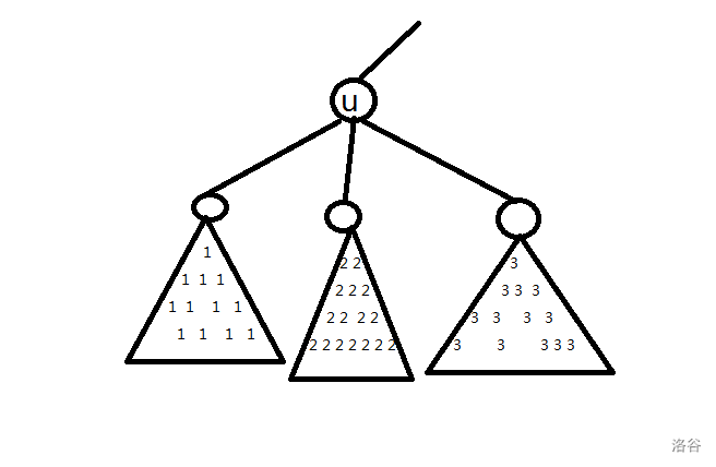 接下来考虑度数 \(> B\) 的点。我们把 \(u\) 的每个子树内的点分别染成一种颜色,如图。