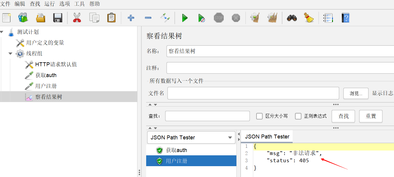 通过Fiddler抓包工具了解到用户注册需要有auth的token,我们可以通过json提取器或正则表达式获得token值,此处以json为例