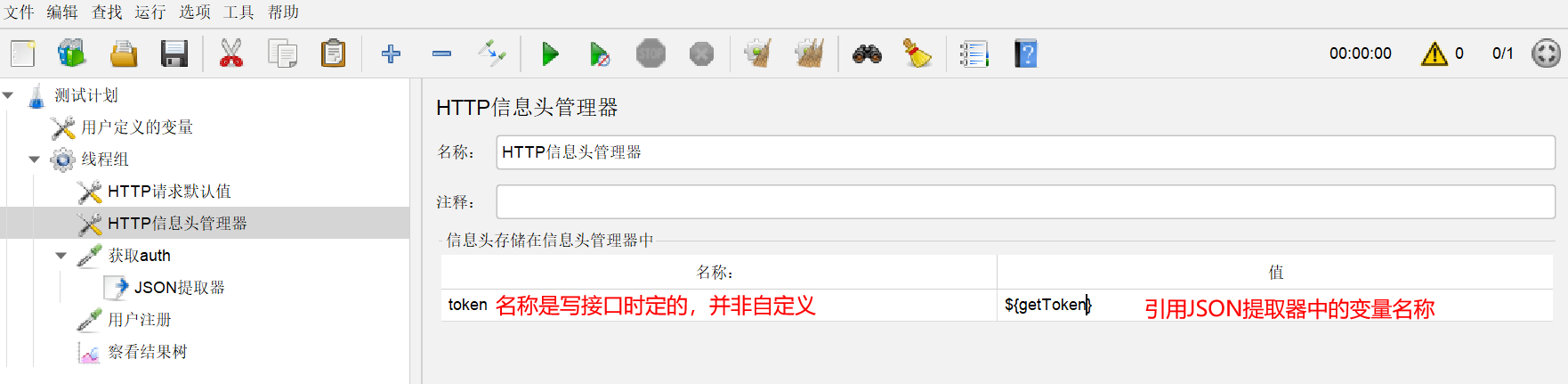 在信息头元件中引用json提取器变量名,使用正则表达式提取器则使用正则表达式提取器中的引用名称