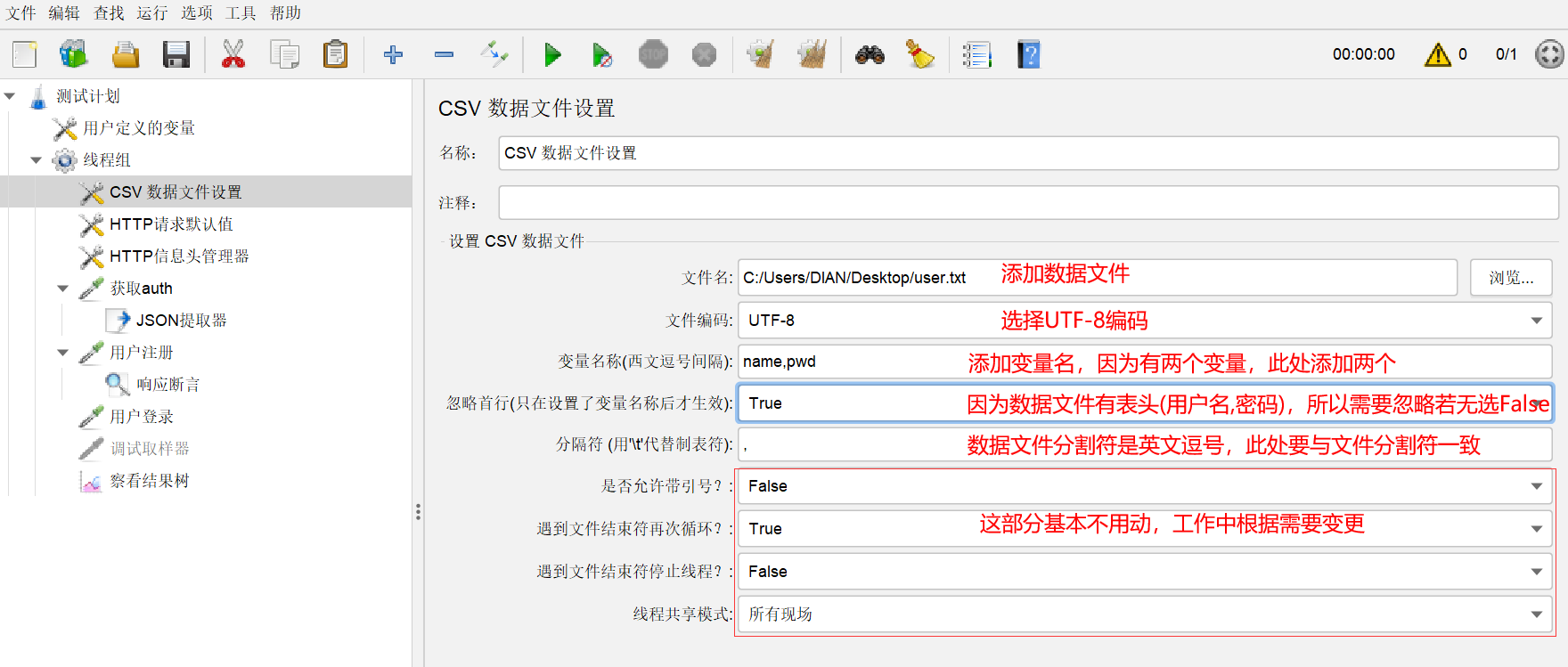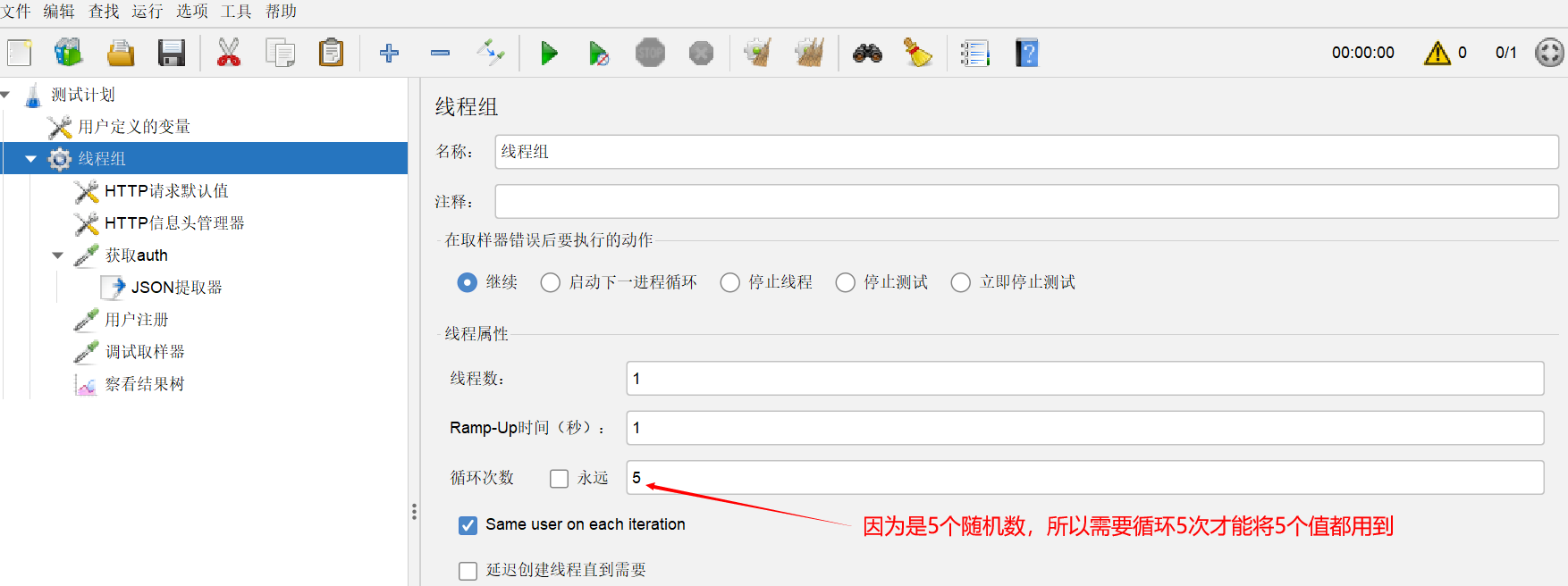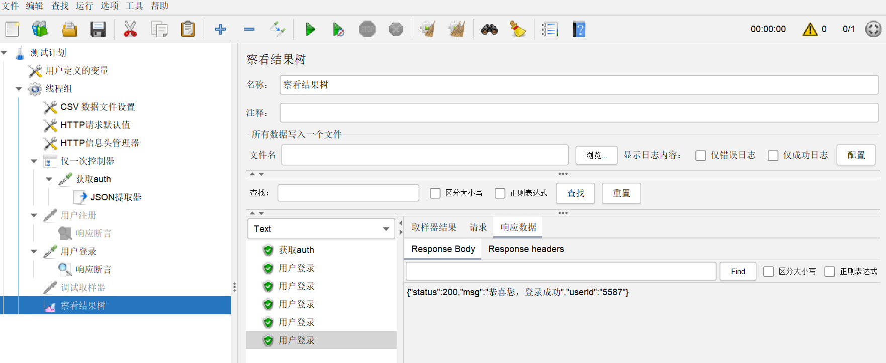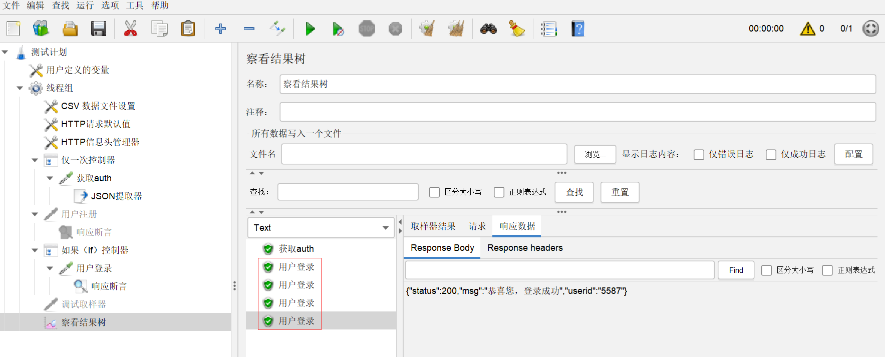 因为数据文件中有5条数据,所以线程组中循环次数要填写5,然后执行脚本,执行结果就一目了然啦
