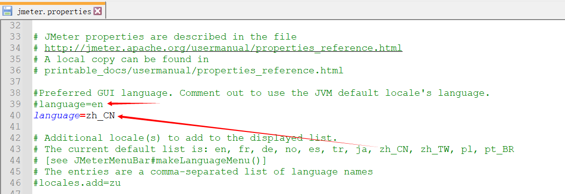 若通过jmeter.bat使用上面的方法修改,仅当此生效,如需长期生效需修改jmeter.properties文件,找到language=en去掉注释#,将en改为zh_CN