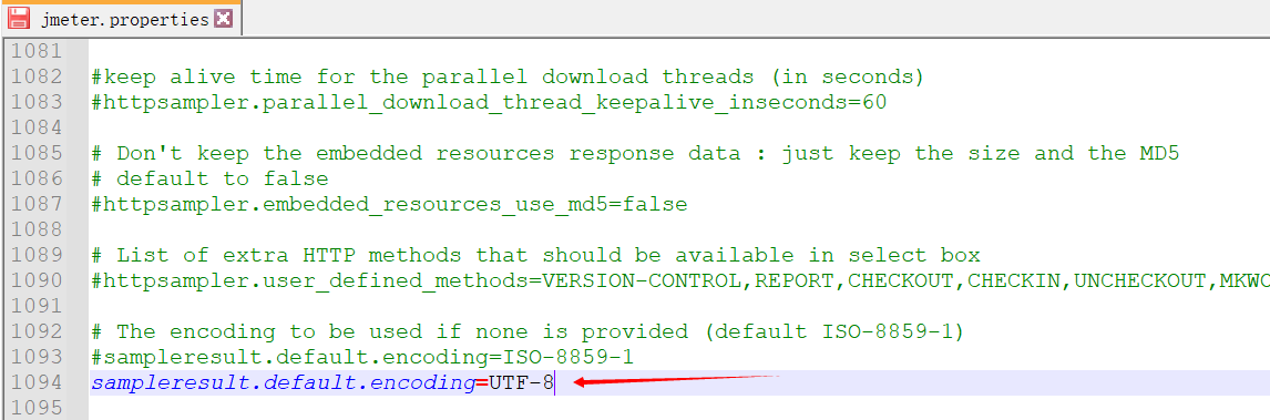 方法二: 修改jmeter.properties文件中的sampleresult.default.encoding=ISO-8859-1,去掉注释#,将ISO-8859-1改为UTF-8