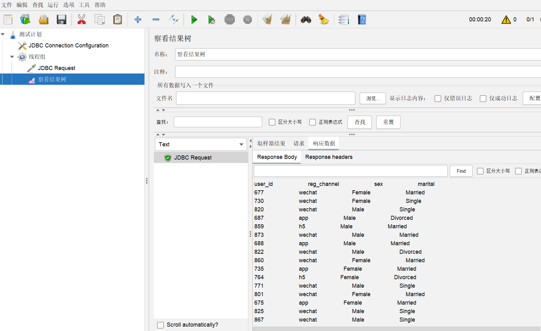 添加察看结果树元件,运行脚本就可以查询到数据啦