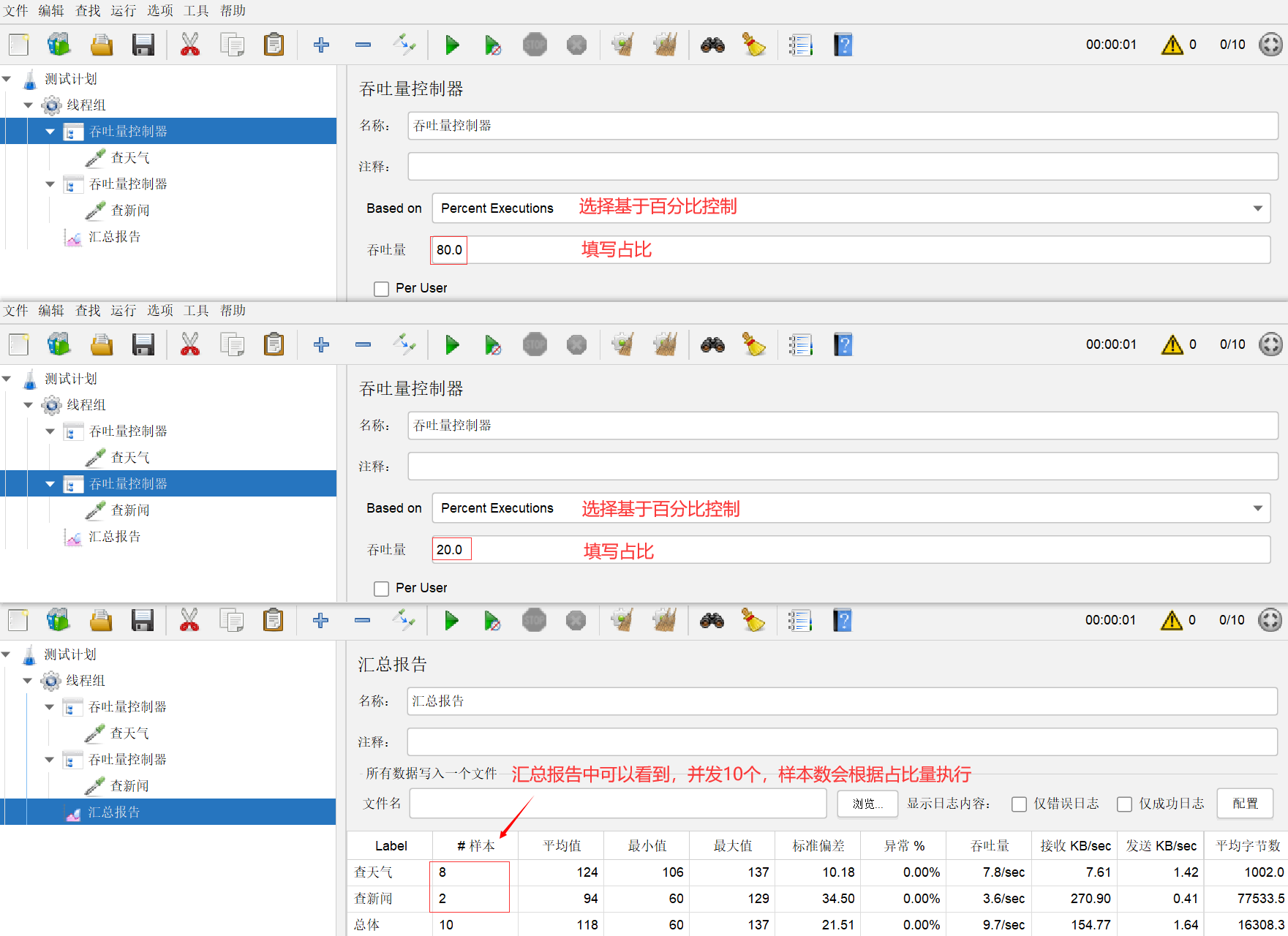 此处只粘贴基于百分比控制的示例截图,基于总数控制使用方法与百分比控制相同;在一个线程组内总数控制器和百分比控制器可组合使用;勾选Per User后所填占比数将失效,结果将是实际并发数,请自行操作验证实际响应结果