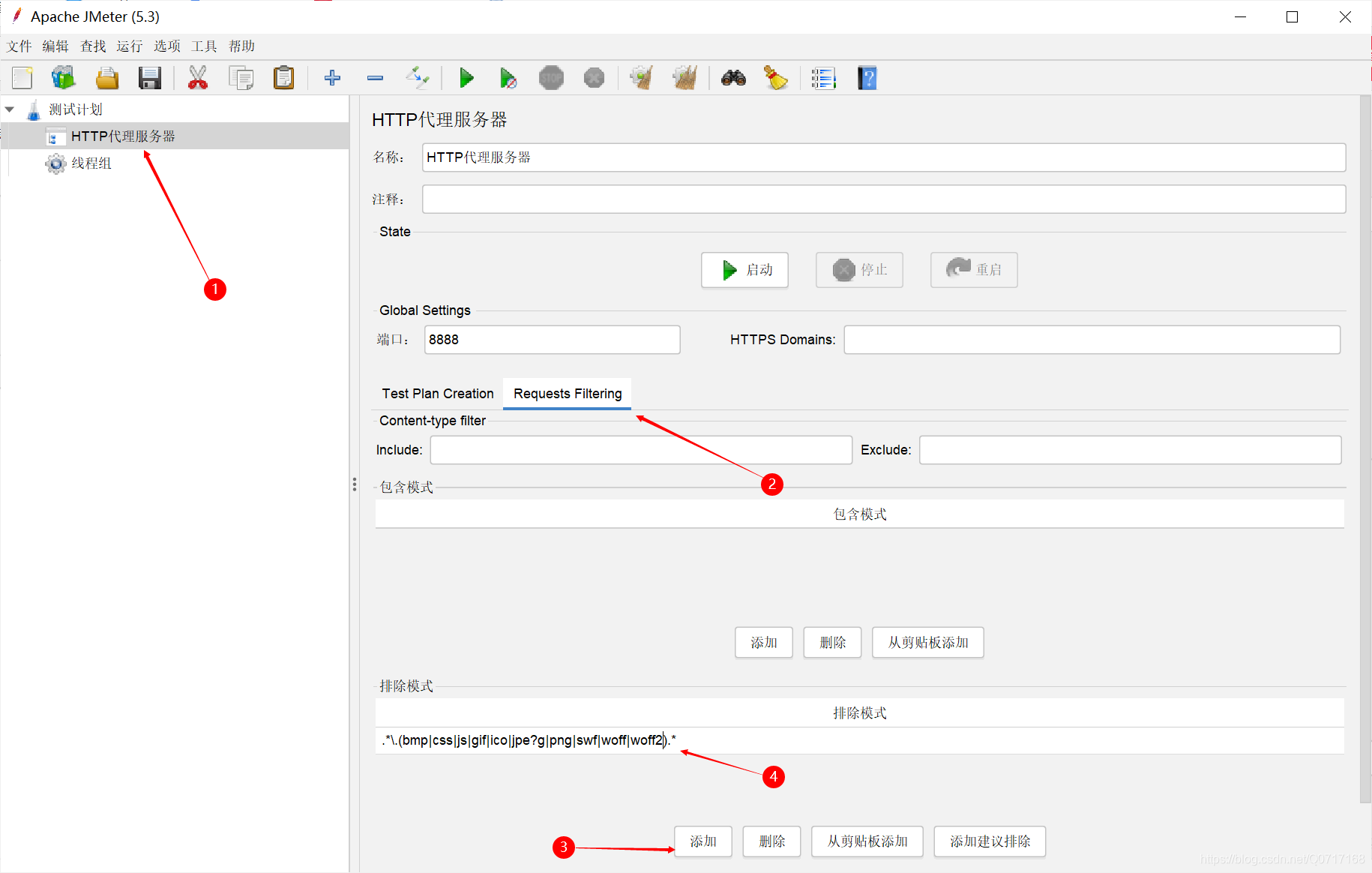 选择【HTTP代理服务器】元件,在“Requests Filtering”中添加排除模式,输入正则表达式.*\.(bmp|css|js|gif|ico|jpe?g|png|swf|woff|woff2).*