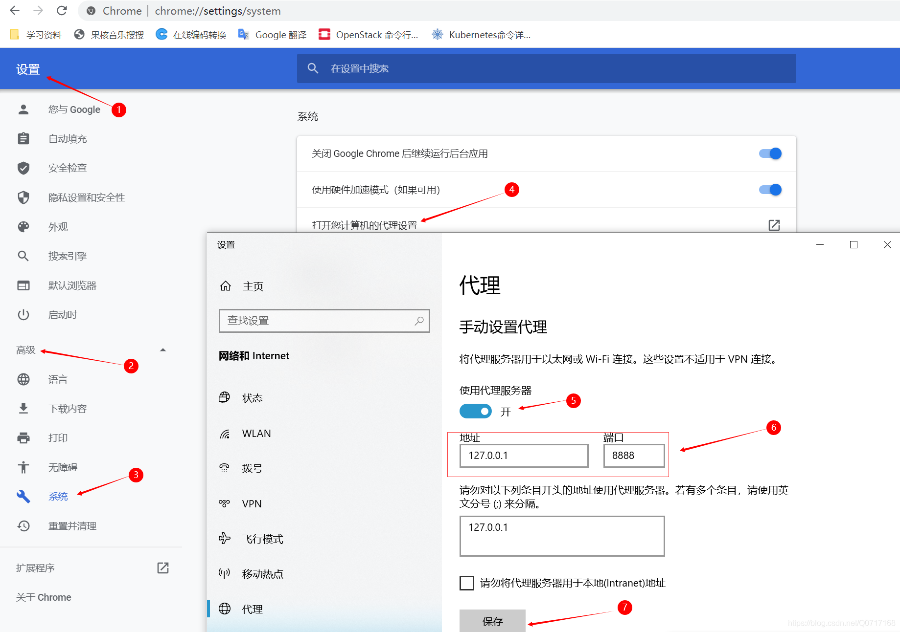 【设置】→【高级】→【系统】→【打开您计算机的代理设置】→【开启代理服务器】,输入地址及端口号