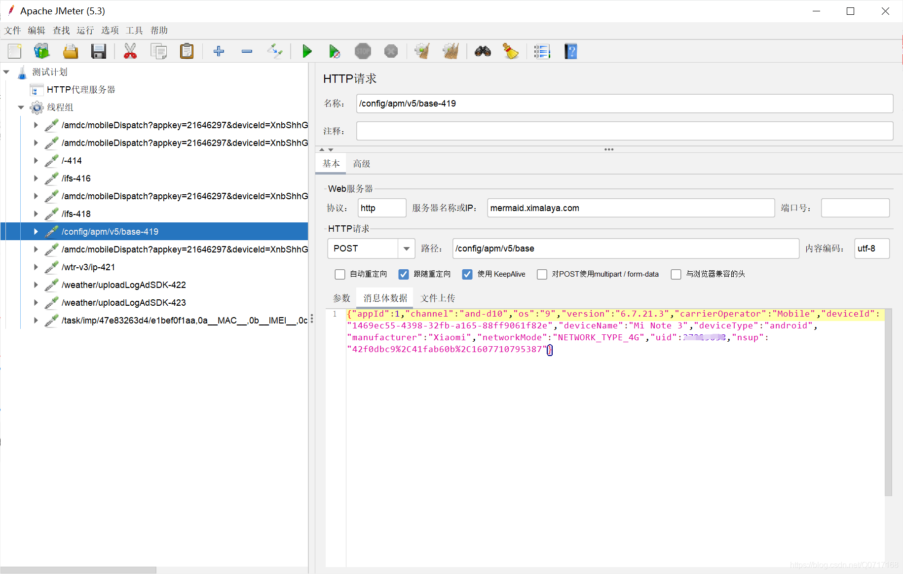 上文中的第八步操作是在手机上运行App并进行相应操作JMeter线程组就会出现录制信息啦