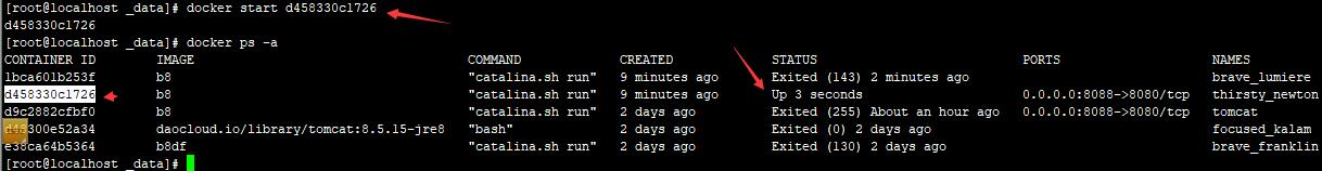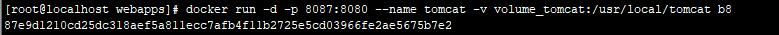 ①docker run -d -p 8087:8080 --name tomcat -v volume_tomcat:/usr/local/tomcat b8dfe9ade316