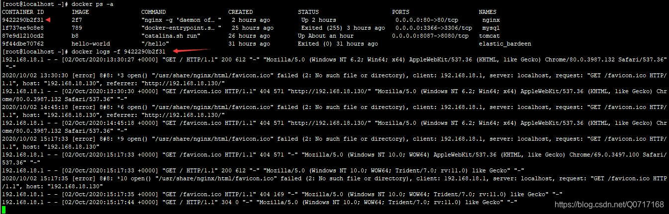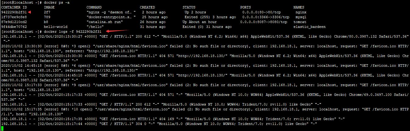 docker logs -f 容器名或ID :查看容器日志,-f参数指滚动查看,可省略