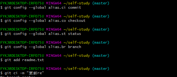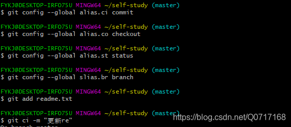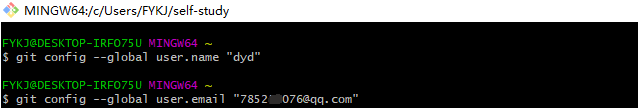Git安装不做过多解释(官网现在相应系统安装包安装即可,Git官网地址:https://git-scm.com/),Git安装完毕后需自报家门,输入gitHub名字及邮箱,命令如下: