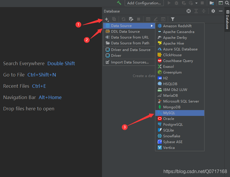 如下图,点击加号,选择【Data Source】→【MySQL】