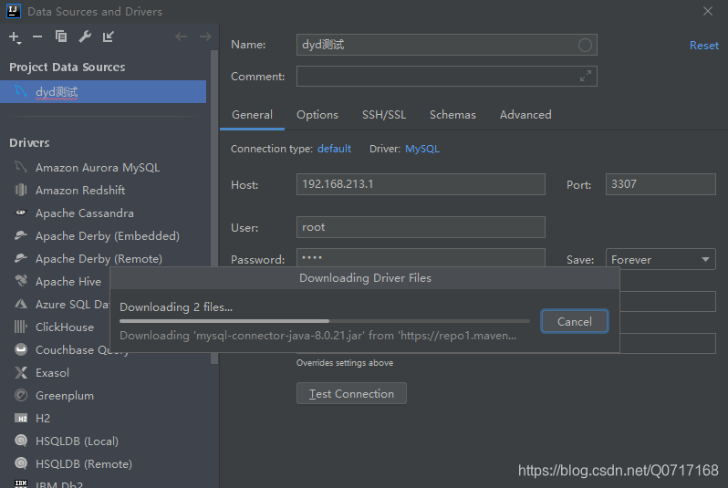 选择MySQL后会弹出如下图窗口,对本次连接命名,输入主机地址、端口、数据库账号密码,点击【Test Connection】,提示驱动文件未下载