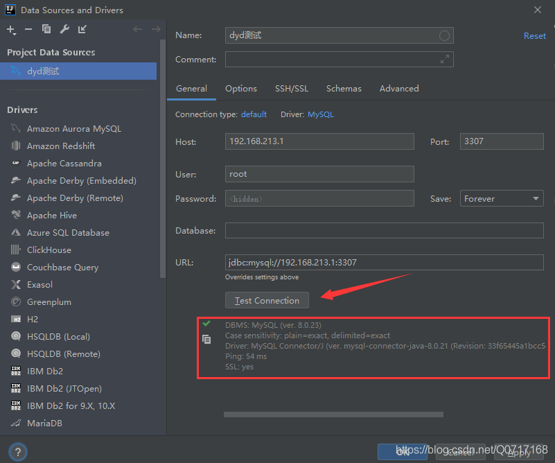 驱动文件下载成功后IDEA会主动再次尝试连接,也可手动测试连接,连接成功会出现如下图信息