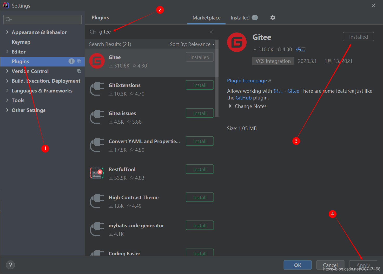 点击【File】→【Settings…】,找到插件选项【Plugins】,或者直接搜索plugins也可以,在插件内搜索gitee,然后点击【Install】,安装完成后点击【Apply】→【OK】