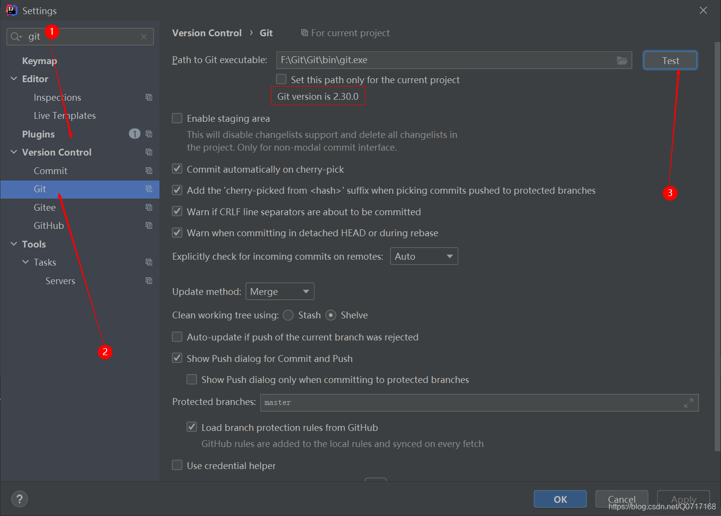 点击【File】→【Settings…】,搜索git,点击【Git】,点击【Test】,若已安装会显示Git版本,否则会报错并显示下载地址,出现版本号有点击【OK】