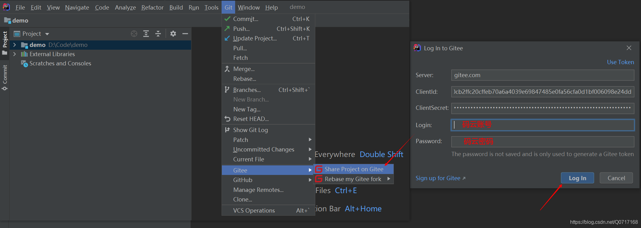点击【Git】→【Gitee】→【Share Project Gitee】,弹出登录码云弹框,输入码云账号和密码后点击登录按钮【Log In】