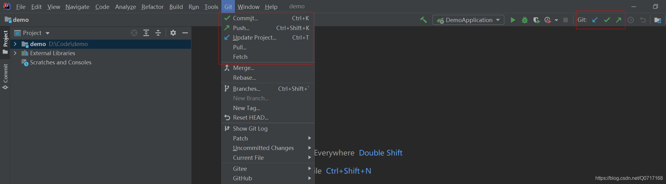 本地仓库添加成功后,菜单栏VCS变更为Git,并出现Git相关操作指令,至此Git配置完成