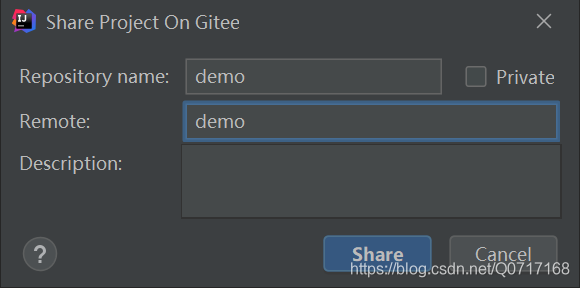 登录成功后需要创建远程仓库,输入仓库名称,Remote一般默认为origin,由于我这边已存在所以重新创建,remote是远程名称,这个改了一定要记得,否则代码无法推送到远程仓库
