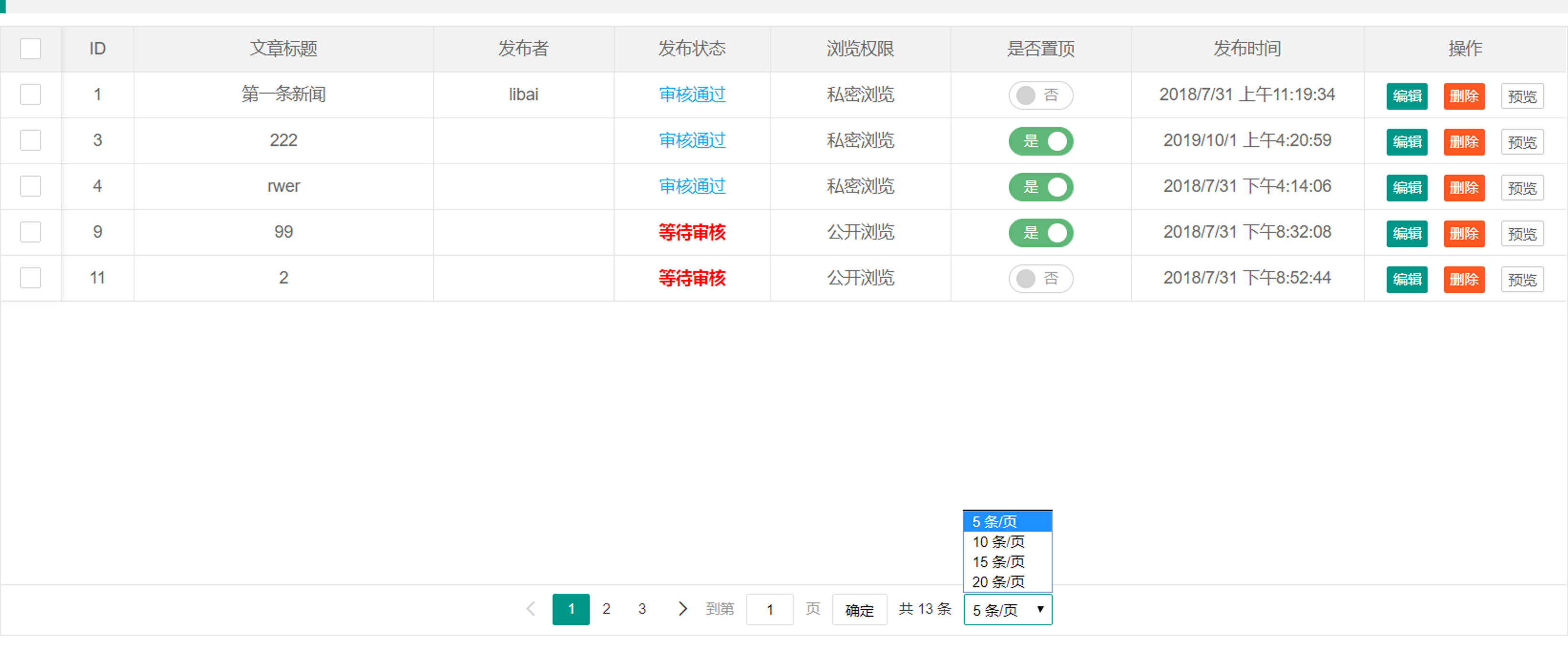 - 设置每页显示条数limit,每页条数的选择项limits(可选),数据总数,不用设置,会自动从后端获取。