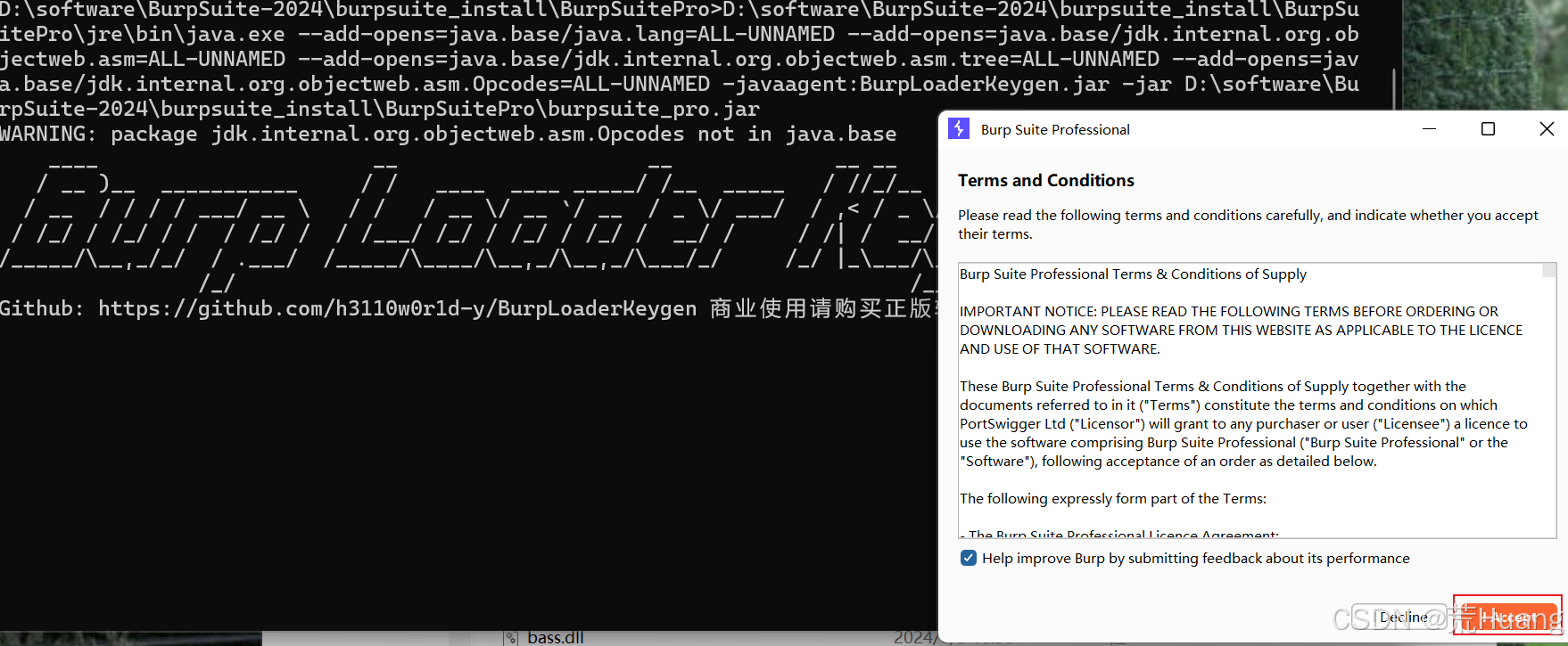 D:\software\BurpSuite-2024\burpsuite_install\BurpSuitePro\jre\bin\java.exe --add-opens=java.base/java.lang=ALL-UNNAMED --add-opens=java.base/jdk.internal.org.objectweb.asm=ALL-UNNAMED --add-opens=java.base/jdk.internal.org.objectweb.asm.tree=ALL-UNNAMED --add-opens=java.base/jdk.internal.org.objectweb.asm.Opcodes=ALL-UNNAMED -javaagent:BurpLoaderKeygen.jar -jar D:\software\BurpSuite-2024\burpsuite_install\BurpSuitePro\burpsuite_pro.jar
