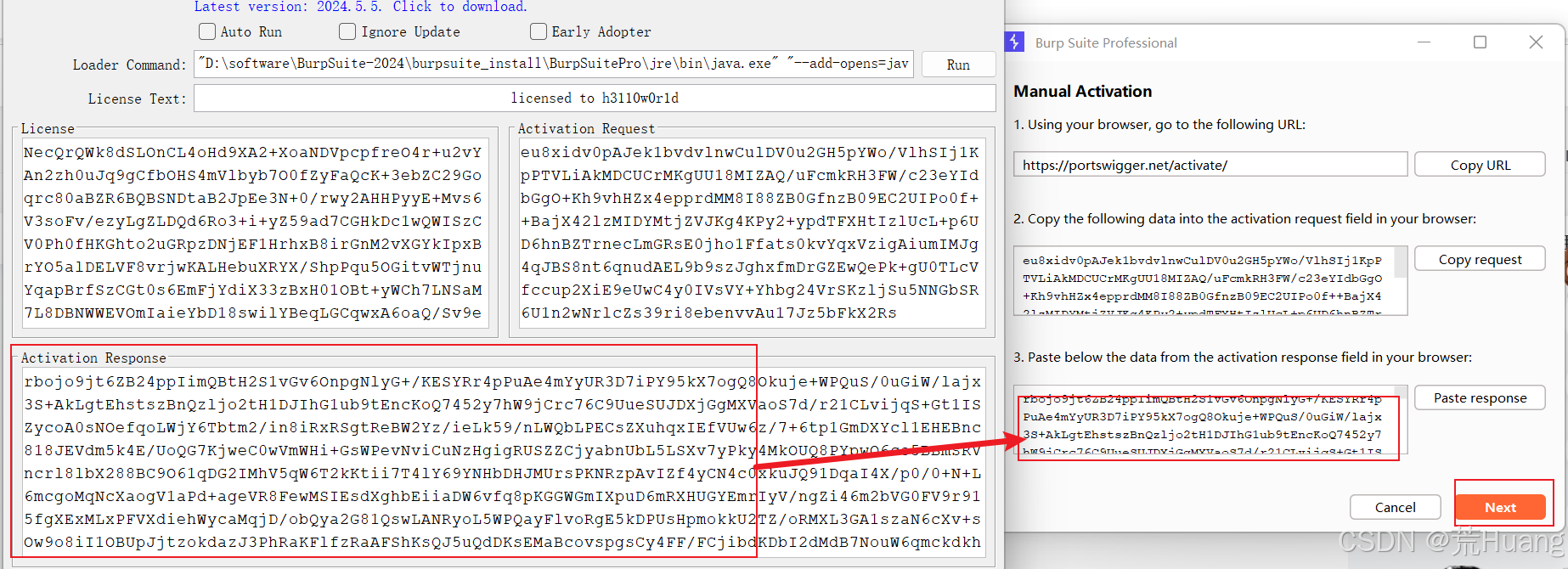 7.将左侧窗口的Activation Response的值复制粘贴到激活页面的第三个输入框内,点击Next