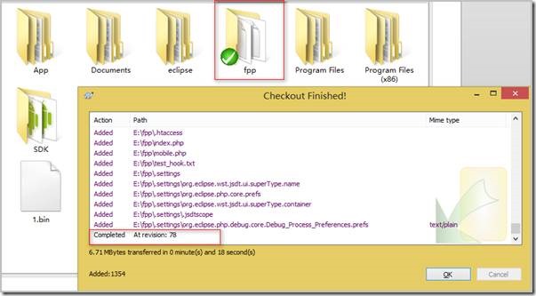 3. svn提示检出成功,在目录下可以找到检出的项目。
