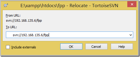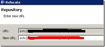 4. 对于以前的项目,重定向到新的svn服务器,右键->TortoiseSVN->Relocate,在弹出的对话框中填写新的地址,TortoiseSVN会提示修改成功,之后,就可以使用新的svn了。