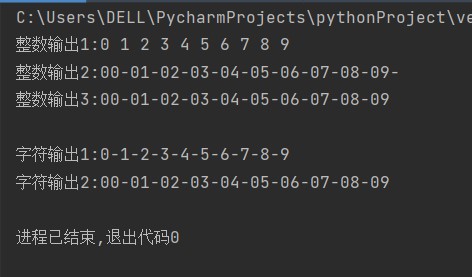 1 x=list(range(10)) 2 3 print('整数输出1:',end='') 4 for i in x: 5 print(i,end=' ') 6 7 print('\n整数输出2:',end='') 8 for i in x: 9 print(f'{i:02d}',end='-') 10 11 print('\n整数输出3:',end='') 12 for i in x[:-1]: 13 print(f'{i:02d}',end='-') 14 print(f'{x[-1]:02d}') 15 16 print('\n字符输出1:',end='') 17 y1=[str(i) for i in range(10)] 18 print('-'.join(y1)) 19 20 print('字符输出2:',end='') 21 y2=[str(i).zfill(2) for i in range(10)] 22 print('-'.join(y2))