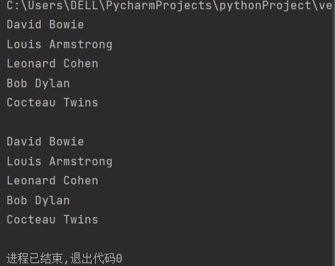 1 name_list=['david bowie','louis armstrong','leonard cohen','bob dylan','cocteau twins'] 2 for name in name_list: 3 print(name.title()) 4 5 print() 6 7 name_list_captilize=[name.title() for name in name_list] 8 print('\n'.join(name_list_captilize))