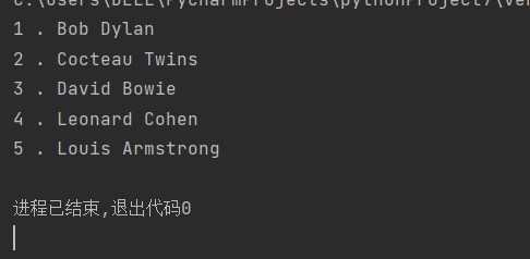 1 name_list=['david bowie','louis armstrong','leonard cohen','bob dylan','cocteau twins'] 2 i=1 3 name_list=sorted(name_list) 4 for name in name_list: 5 print(i,'.',name.title()) 6 i=i+1