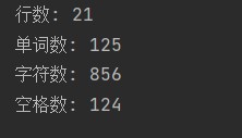 1 text='''The Zen of Python, by Tim Peters 2 3 Beautiful is better than ugly. 4 Explicit is better than implicit. 5 Simple is better than complex. 6 Complex is better than complicated. 7 Flat is better than nested. 8 Sparse is better than dense. 9 Readability counts. 10 Special cases aren't special enough to break the rules. 11 Although practicality beats purity. 12 Errors should never pass silently. 13 Unless explicitly silenced. 14 In the face of ambiguity, refuse the temptation to guess. 15 There should be one-- and preferably only one --obvious way to do it. 16 Although that way may not be obvious at first unless you're Dutch. 17 Now is better than never. 18 Although never is often better than *right* now. 19 If the implementation is hard to explain, it's a bad idea. 20 If the implementation is easy to explain, it may be a good idea. 21 Namespaces are one honking great idea -- let's do more of those!''' 22 line=text.split('\n') 23 word=text.split(' ') 24 print('行数:',len(line)) 25 print('单词数:',len(word)) 26 print('字符数:',len(text)) 27 print('空格数:',text.count(' '))