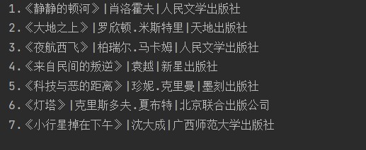 1 book_list=[['静静的顿河','肖洛霍夫','金人','人民文学出版社'], 2 ['大地之上','罗欣顿.米斯特里','张亦绮','天地出版社'], 3 ['夜航西飞','柏瑞尔.马卡姆','陶立夏','人民文学出版社'], 4 ['来自民间的叛逆','袁越','','新星出版社'], 5 ['科技与恶的距离','珍妮.克里曼','詹蕎語','墨刻出版社'], 6 ['灯塔','克里斯多夫.夏布特','吕俊君','北京联合出版公司'], 7 ['小行星掉在下午','沈大成','','广西师范大学出版社']] 8 for i in range(len(book_list)): 9 del book_list[i][2] 10 for j in range(len(book_list)): 11 print('{}.《{}》|{}|{}'.format(j+1,book_list[j][0],book_list[j][1],book_list[j][2]))