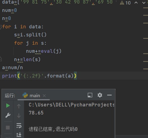 1 data=['99 81 75','30 42 90 87','69 50 96 77 89 93','82 99 78 100'] 2 num=0 3 n=0 4 for i in data: 5 s=i.split() 6 for j in s: 7 num+=eval(j) 8 n+=len(s) 9 a=num/n 10 print('{:.2f}'.format(a))