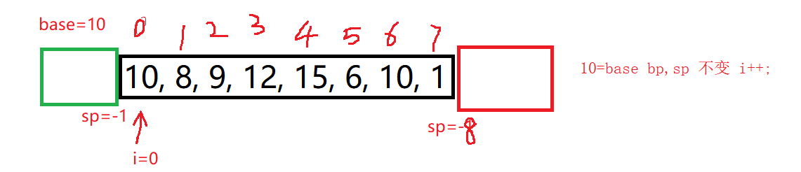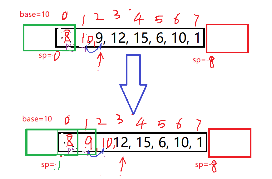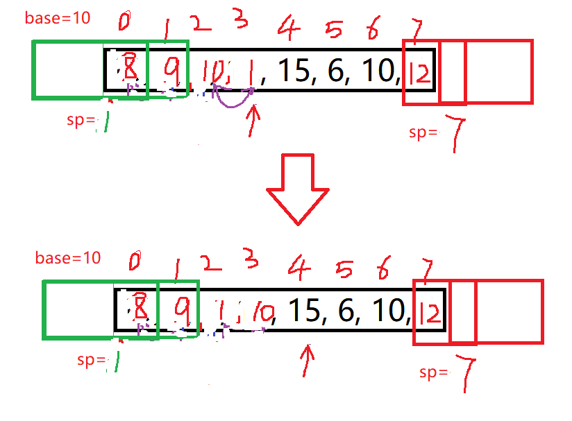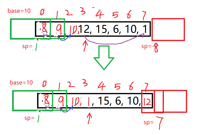 第四步:12>10,大于base的红色区域扩张(和区域前第一个元素交换);i不变,sp--;