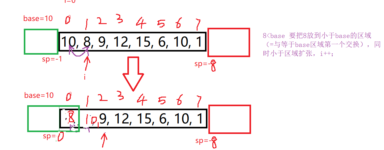 第二步:8<base 要把8放到小于base的区域(与等于base区域第一个交换),同时小于区域扩张,i++;