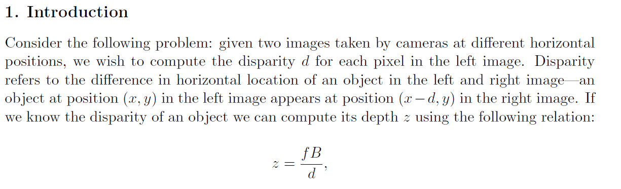 考虑一下问题:给定相机在不同水平位置拍摄的两幅图像,我们希望计算左侧图像中每个像素的视差d。视差是指一个物体在图像左右两个位置的水平差,例如,物体在左侧图片中的左边是(x,y),那么这个物体就会出现在右侧图片的(x-d,y)的位置。所以,已知d,我们就可以计算出该物体的深度z。