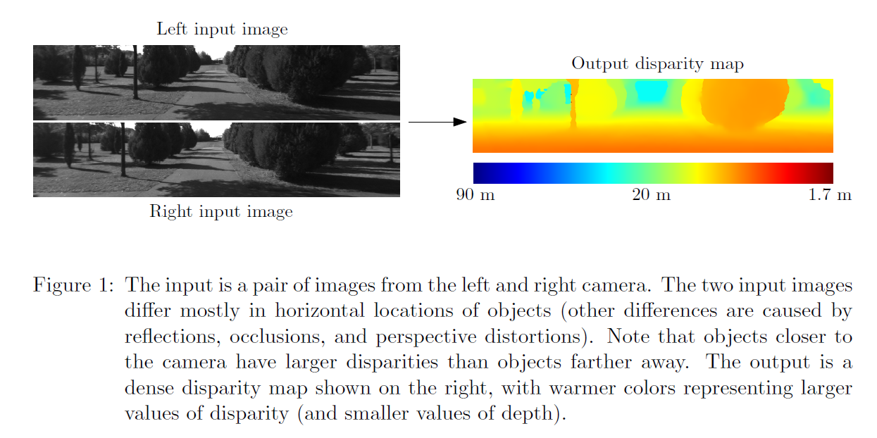 图1:输入时双目相机拍摄的一对图片,两幅图主要的区别是两张图相同物体的水平坐标的差异(其他差异:反光、遮挡、镜头畸变等)。可见越接近于镜头的物体,视差越大,上图右侧显示的是视差密度图。暖色调区域表示视差大的区域,或者说是比较小的深度值。