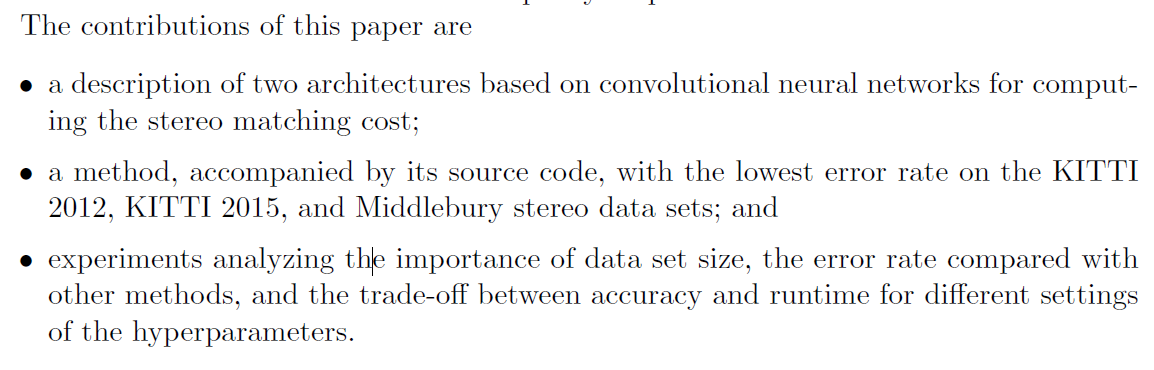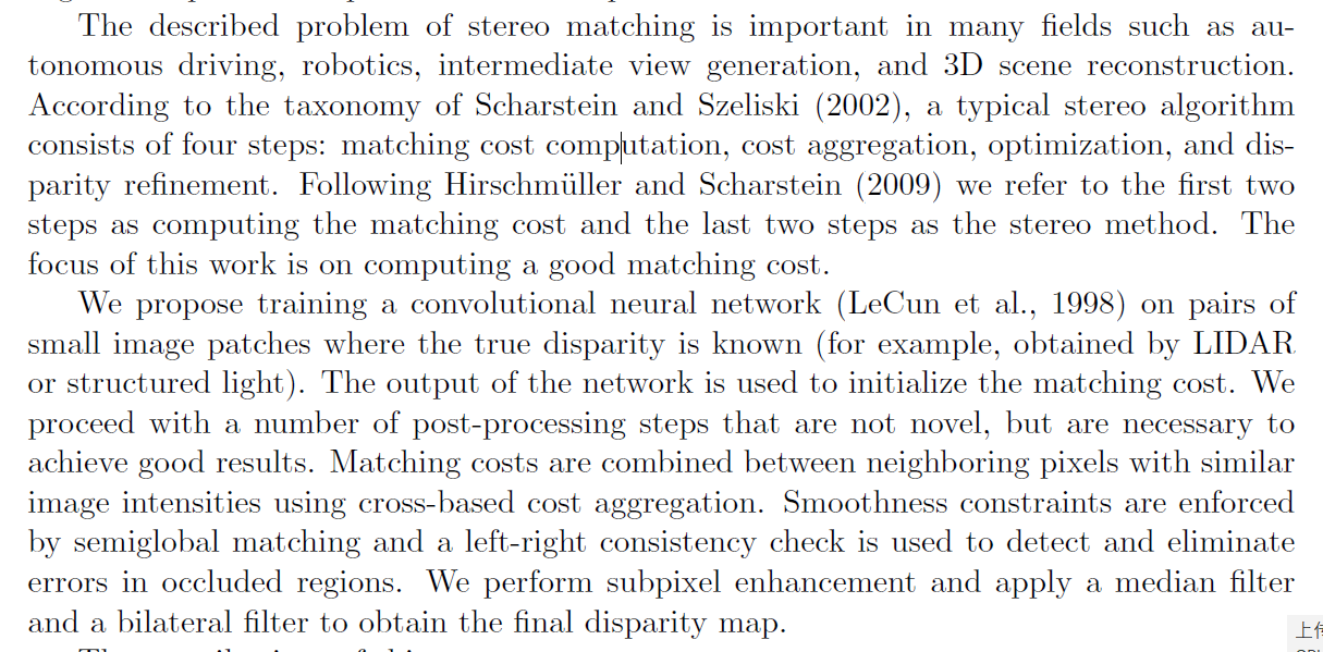 我们提出了一种从已纠正的一对图片来提取深度信息的方法。我们的方法聚焦于很多立体构建算法的第一阶段:匹配损失(match cost)计算。我们通过卷积神经网络通过对小的图像块的相似度的学习,来解决这个问题。通过构建一个二分类的数据集(相似,不相似的样本)进行有监督的训练。我们提出连个网络去实现这个任务,一个调整速度、一个调整精度。cnn的输出被用作立体匹配的成本(stereo matching cost)。接下来进行:cross-base 成本聚合、SGM、左右一致性检查,亚像素级增强、中值滤波、双边滤波。我们把该方法在KITTI2012,KITTI2015以及Middlebury stereo数据集进行评估,可以看到我们的方法比其他的方法效果好