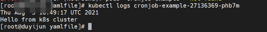 从图可以看出,一分钟创建一个pod并执行echo Hello from k8s cluster