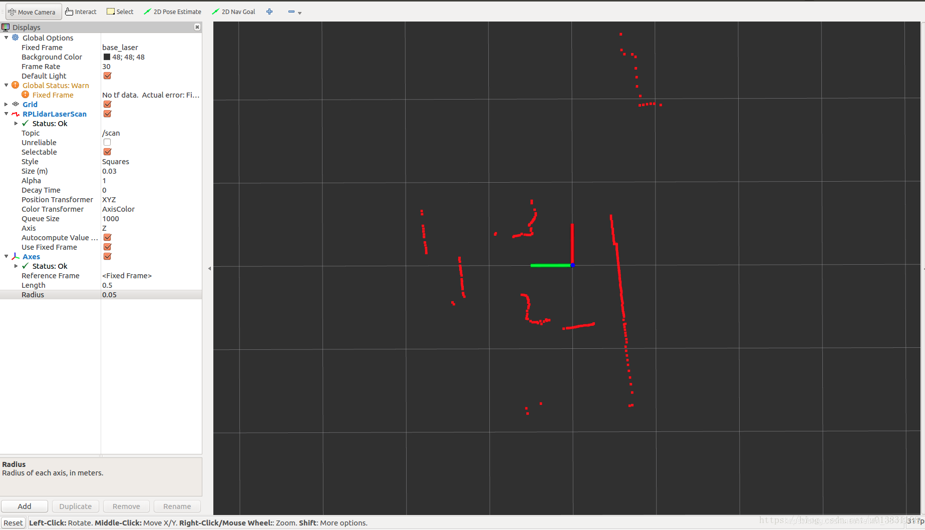 到这里我们就可以看到rviz中,rplidar的运行界面了,如下: