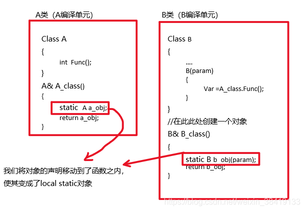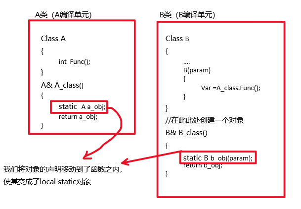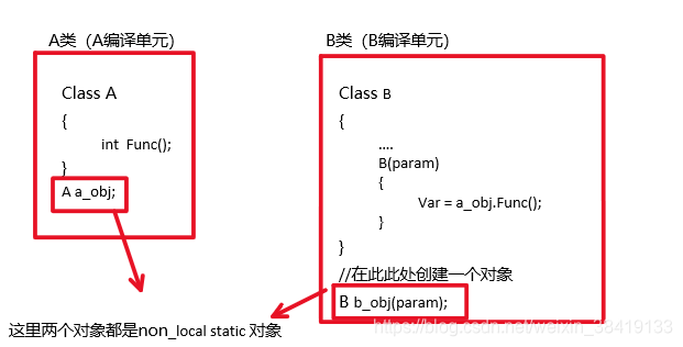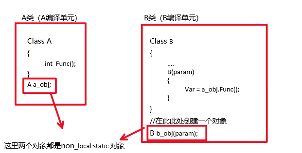 在这里,有一个的问题就是,在创建B类对象 b_obj时会调用到a_obj对象的函数,除非a_obj对象比b_obj对象先被初始化,否则,b_obj对象会调用到未被初始化的a_obj,从而发生错误。