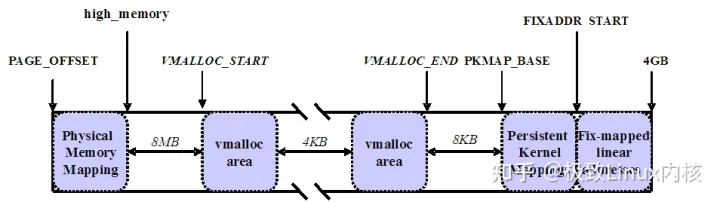 内核将高端内存划分为3部分:VMALLOC_START~VMALLOC_END、KMAP_BASE~FIXADDR_START和FIXADDR_START~4G。