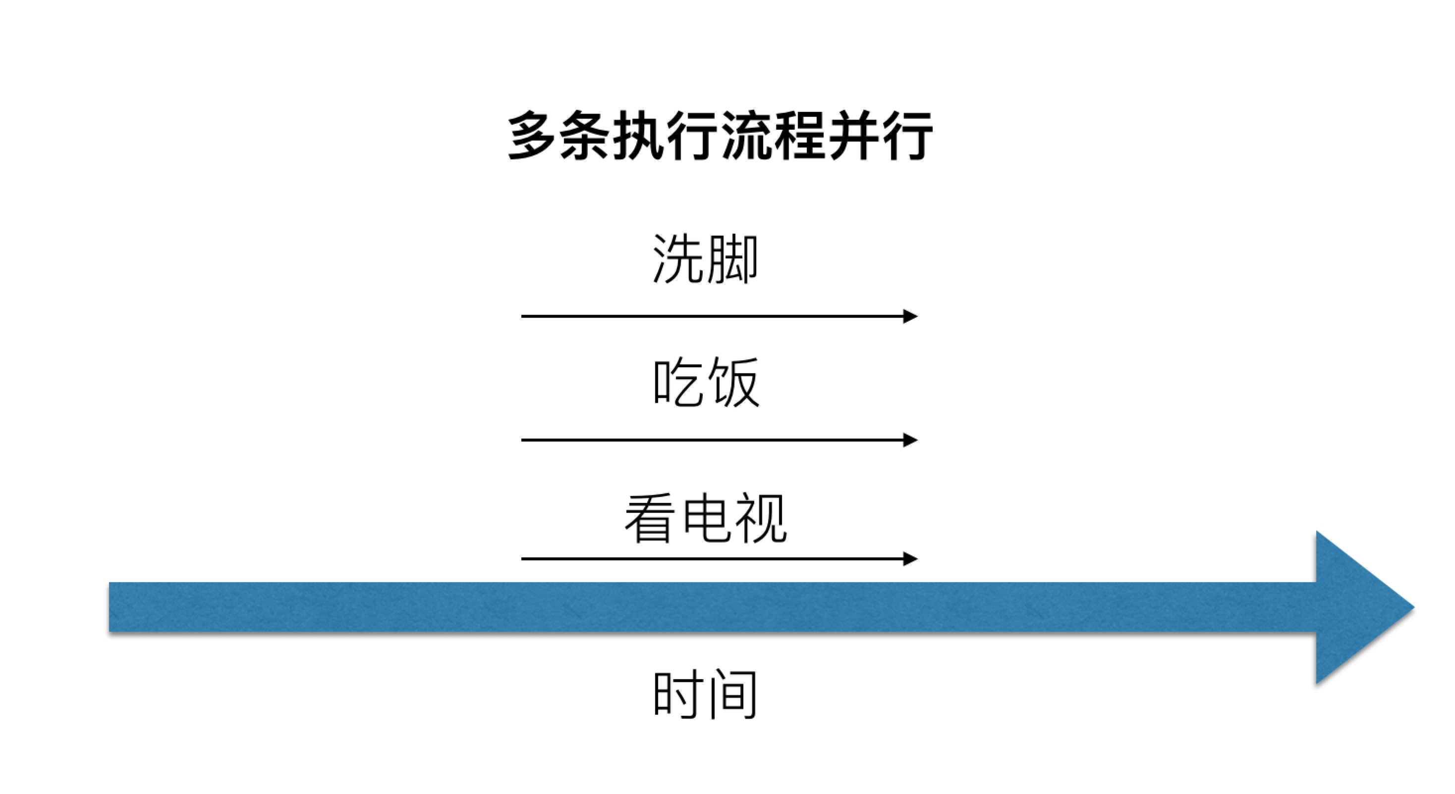 如果改成并发执行,吃饭,洗脚,看电视同时进行,则非常节省时间。