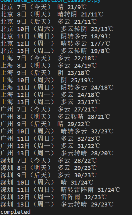 要求:在中国气象网(http://www.weather.com.cn)给定城市集的7日天气预报,并保存在数据库。