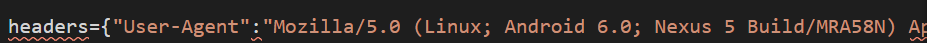 headers={"User-Agent":"Mozilla/5.0 (Linux; Android 6.0; Nexus 5 Build/MRA58N) AppleWebKit/537.36 (KHTML, like Gecko) Chrome/70.0.3538.25 Mobile Safari/537.36"}