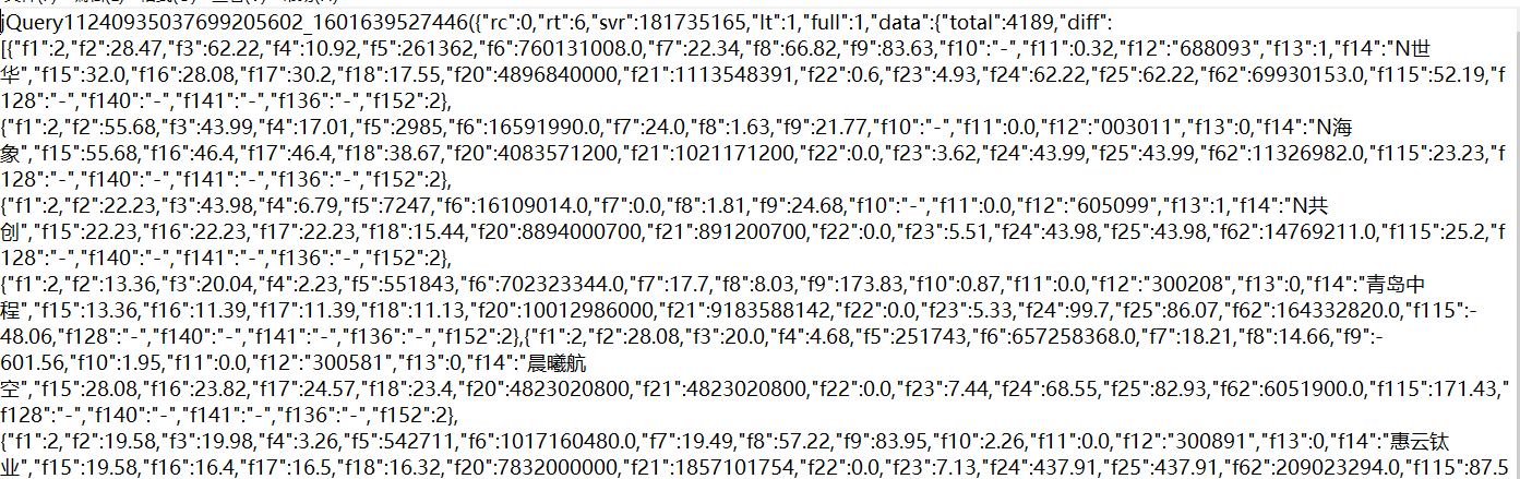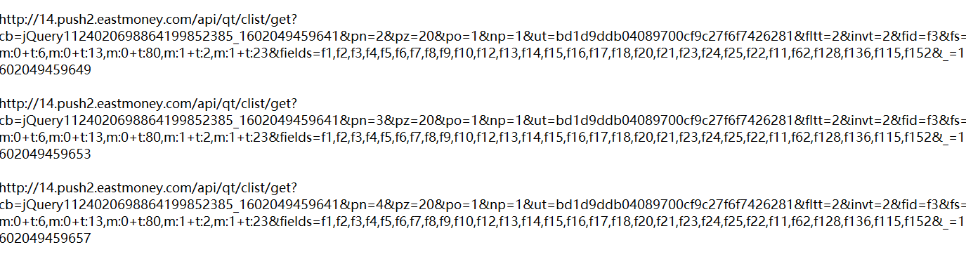 url = "http://2.push2.eastmoney.com/api/qt/clist/get?cb=jQuery11240935037699205602_1601639527446&pn="+str(page)+"&pz=20&po=1&np=1&ut=bd1d9ddb04089700cf9c27f6f7426281&fltt=2&invt=2&fid=f3&fs=m:0+t:6,m:0+t:13,m:0+t:80,m:1+t:2,m:1+t:23&fields=f1,f2,f3,f4,f5,f6,f7,f8,f9,f10,f12,f13,f14,f15,f16,f17,f18,f20,f21,f23,f24,f25,f22,f11,f62,f128,f136,f115,f152"